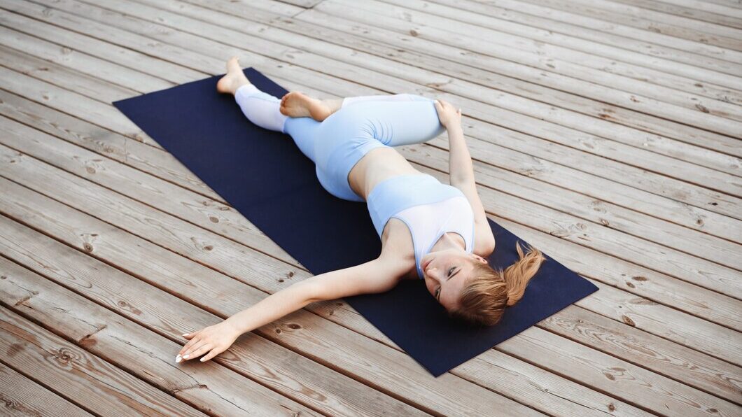 - Супта Матсиендрасана (Поза скручивания лежа): Лягте на спину, согните колени и прижмите их к груди. Вытяните руки в стороны. На выдохе опустите колени вправо, поворачивая голову влево. Задержитесь в этом положении на несколько дыханий, затем повторите в другую сторону. Эта поза мягко массирует органы брюшной полости.