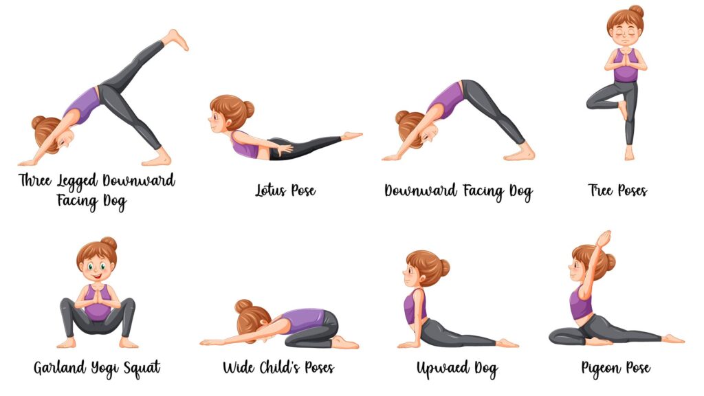 - Врикшасана (поза дерева): Улучшает равновесие, укрепляет мышцы ног и улучшает концентрацию.